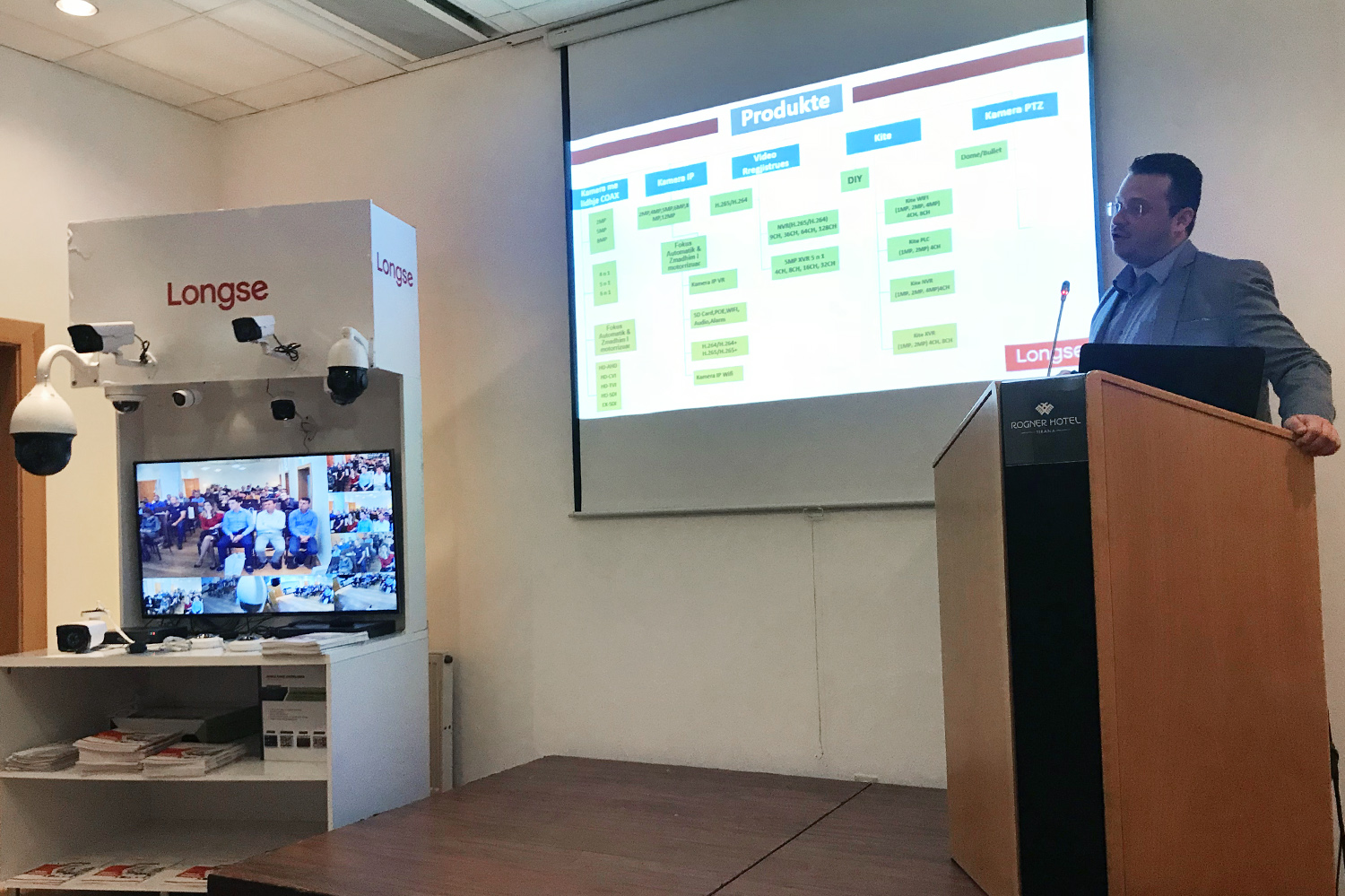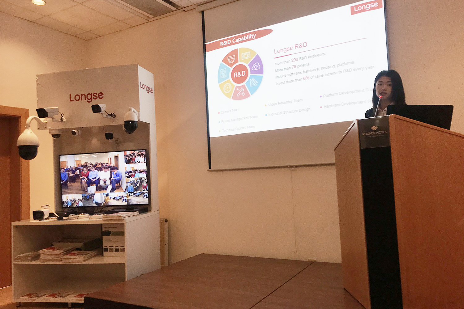 產(chǎn)品發(fā)布由長(zhǎng)視科技2018阿爾巴尼亞代理開(kāi)篇,垂直市場(chǎng)銷(xiāo)售工程師Ermal Sallaku為大家進(jìn)行了詳細(xì)解讀,重點(diǎn)介紹了PT球系列(PT5A、PT7E系列)、DIY套裝(Kits)、NVR系列、網(wǎng)絡(luò)高清系列(LBB60/90系列)、同軸高清系列(LBN24、LVWDC20系列)等明星級(jí)產(chǎn)品以及安防行業(yè)的前沿技術(shù)。在發(fā)布會(huì)過(guò)程中,展臺(tái)中的明星級(jí)攝像機(jī)發(fā)揮渾身解數(shù),在現(xiàn)場(chǎng)透過(guò)熒屏呈現(xiàn)高清盛宴,還原了會(huì)場(chǎng)燈光、顏色、人臉等細(xì)節(jié),讓與會(huì)合作伙伴深度及直觀地享受和了解2018年的最新產(chǎn)品與效果。